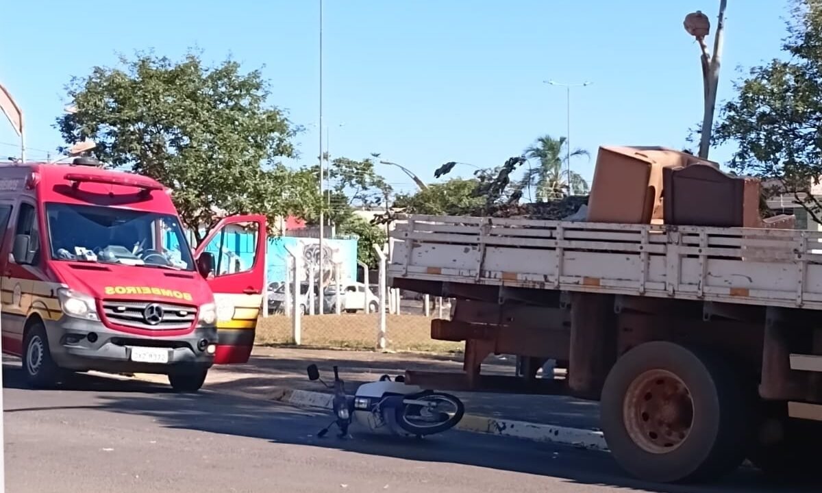 AGORA: Motociclista fica ferida após bater na traseira de caminhão da Prefeitura em rotatória de Birigui