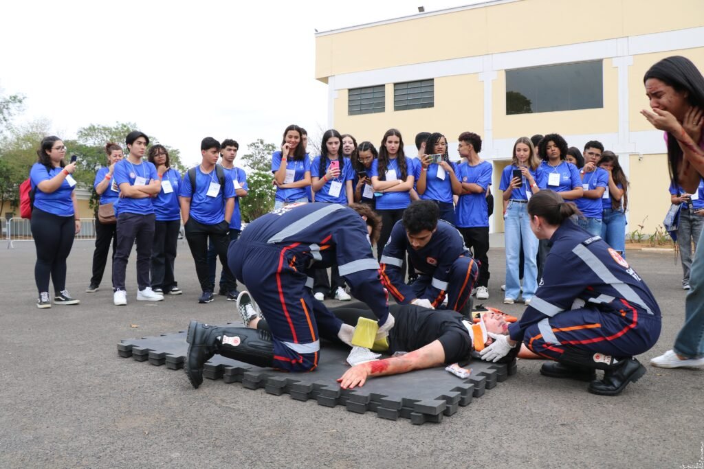 Ao longo do dia, os participantes circularam por cinco estações temáticas — Anatomia e Sutura, Saúde da Mulher, Ortopedia, Trauma (com simulação realística, incluindo uma simulação de queda de avião) e Ligas Acadêmicas — vivenciando atividades teóricas e práticas que os aproximaram do cotidiano de um profissional da saúde.