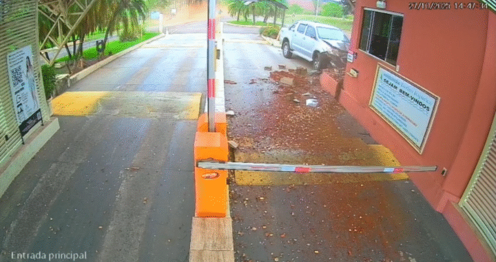 Vídeo: Câmeras flagram caminhonete desgovernada em alta velocidade atingindo guarita em Buritama