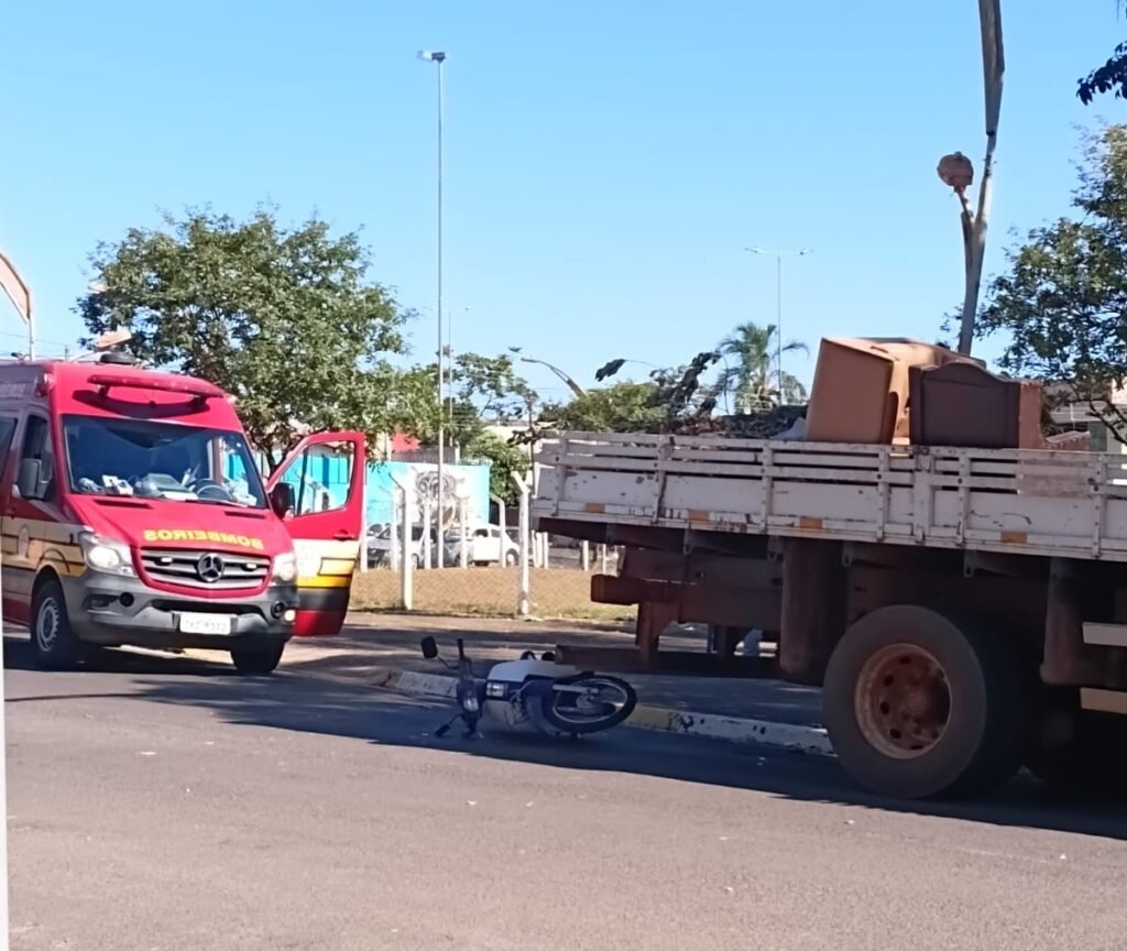 AGORA: Motociclista fica ferida após bater na traseira de caminhão da Prefeitura em rotatória de Birigui