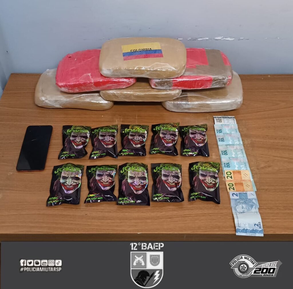 Na vistoria, foram apreendidos seis tijolos de maconha, totalizando 6,230 kg, além de dez pacotes de maconha do tipo Ice Dry, somando 1 kg, R$ 642,00 em dinheiro e um aparelho celular Motorola.
