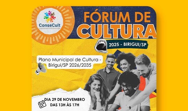 A Secretaria de Cultura e Turismo (Secultur) da Prefeitura de Birigui e o ConseCult (Conselho Municipal de Cultura) realizam no próximo sábado, dia 29 de novembro, das 13h às 17h, na Casa de Cultura Cristina Calixto o Fórum de Cultura Municipal de Cultura 2025, cujo objetivo principal a construção conjunta do Plano Municipal de Cultura de Birigui/SP 2026-2035.