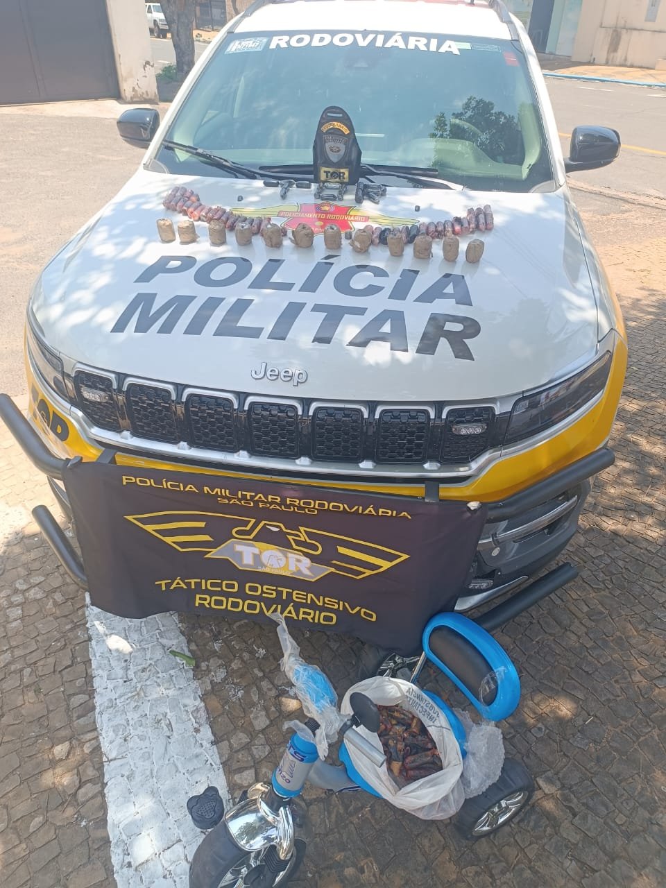 Durante a vistoria no compartimento de bagagens, os policiais encontraram 165 invólucros de pasta base de cocaína, totalizando 2,770 kg da droga, que estavam escondidos no interior dos eixos de um triciclo infantil e de um carrinho de mão.