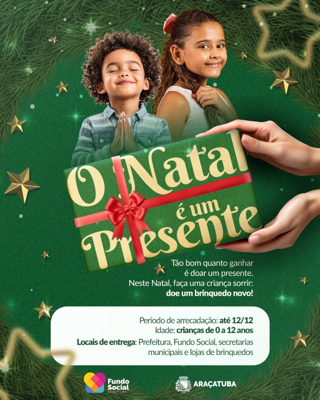 A Prefeitura de Araçatuba, por meio do Fundo Social de Solidariedade, inicia nesta quarta-feira (26) a campanha “O Natal é um Presente”, que promete levar alegria a crianças de até 12 anos neste fim de ano. A iniciativa convida a população a doar brinquedos novos para presentear famílias cadastradas nos serviços de assistência social do município.