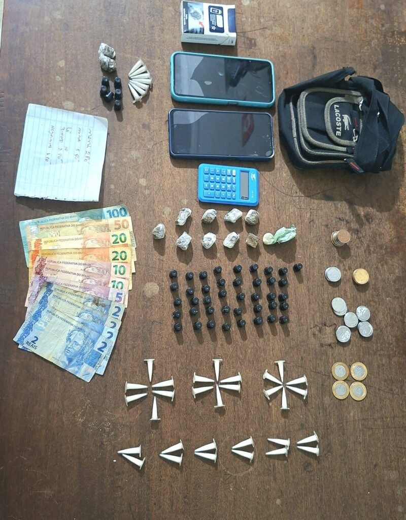 No interior da residência, também foi abordada uma mulher identificada como S.V.D.F, com ela, os policiais encontraram mais porções de drogas escondidas dentro de um maço de cigarros, entregues espontaneamente após questionamento da equipe.