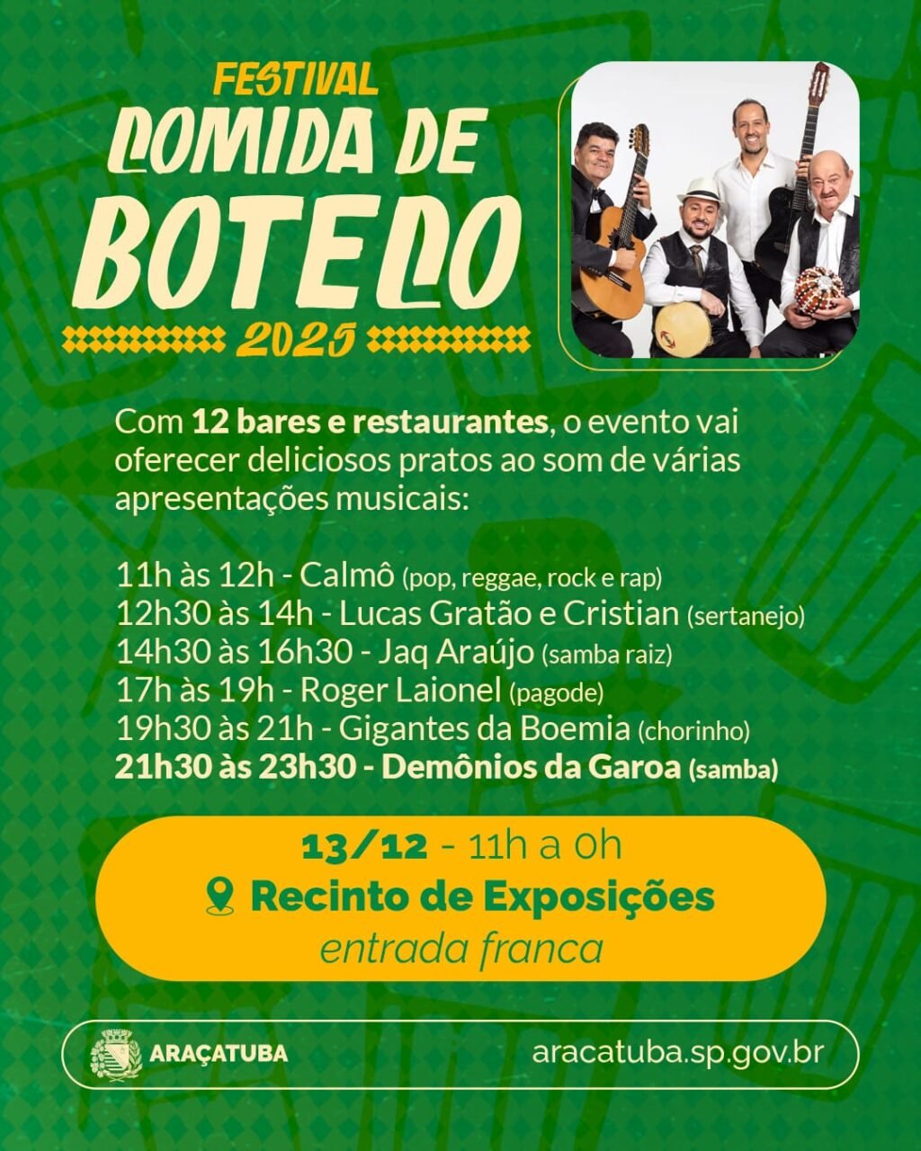 Sábado é dia do Festival Comida de Boteco 2025, com Demônios da Garoa, no Recinto de Exposições de Araçatuba