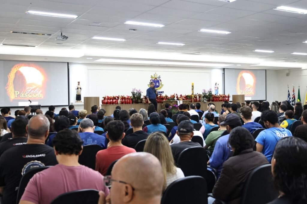 O UniSALESIANO promoveu, no dia 2 de abril, um momento especial de espiritualidade, reflexão e comunhão com a realização da Celebração de Páscoa, organizada pela Pastoral Universitária em parceria com o Departamento de Recursos Humanos. O encontro aconteceu no Auditório Papa Francisco e reuniu colaboradores de diversos setores da instituição.