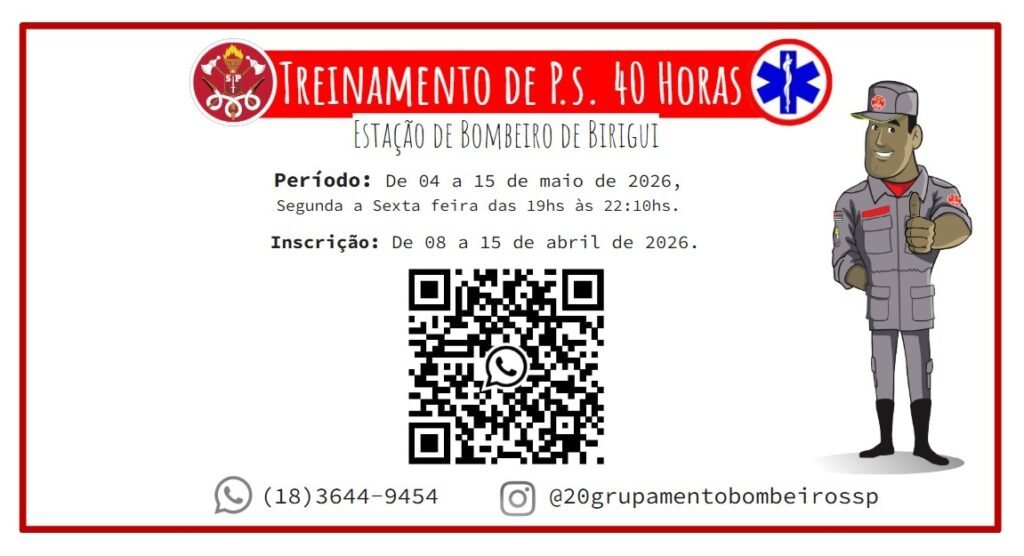 A Estação de Bombeiros de Birigui está com inscrições abertas para o Treinamento de Pronto Socorrismo I/2026, voltado à capacitação da população em técnicas básicas de atendimento pré-hospitalar. O curso terá carga horária de 40 horas-aula e será realizado entre os dias 4 e 15 de maio de 2026, sempre de segunda a sexta-feira, das 19h às 22h10.
