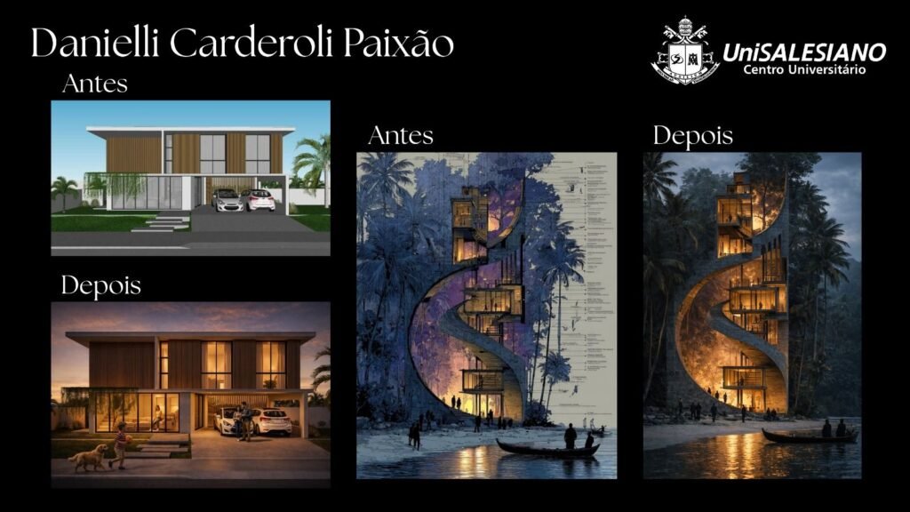 Os alunos acompanharam, em tempo real, a evolução das imagens geradas, observando a aplicação de diferentes materiais, variações de iluminação e estilos arquitetônicos com alto nível de realismo. A apresentação também trouxe resultados desenvolvidos ao longo da imersão, evidenciando o potencial da IA como ferramenta criativa e de otimização de processos.