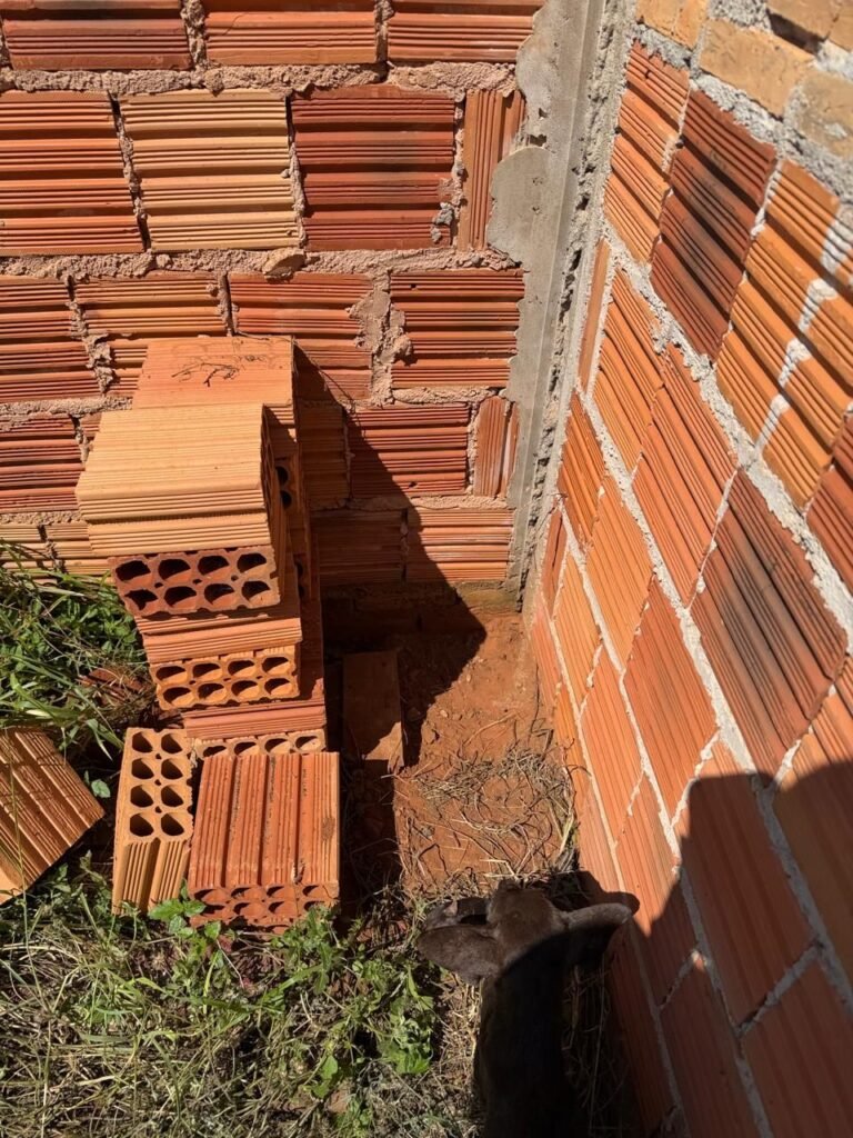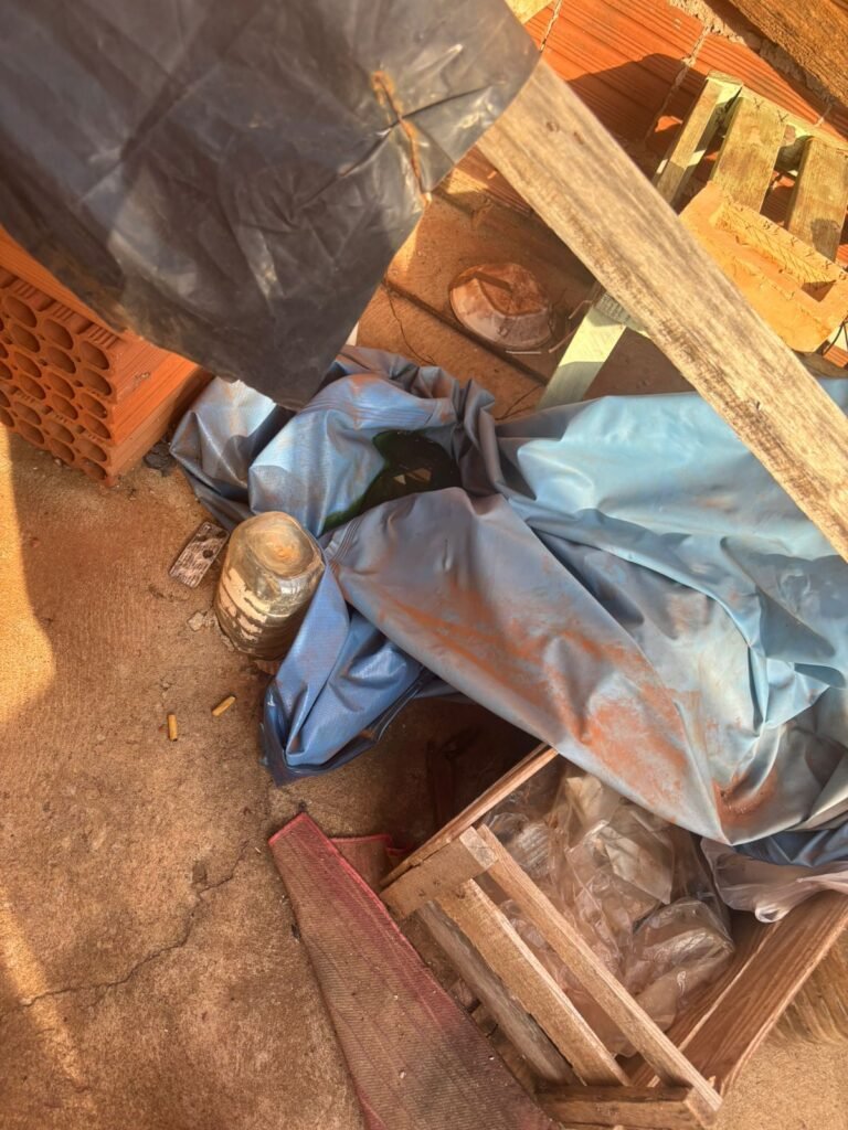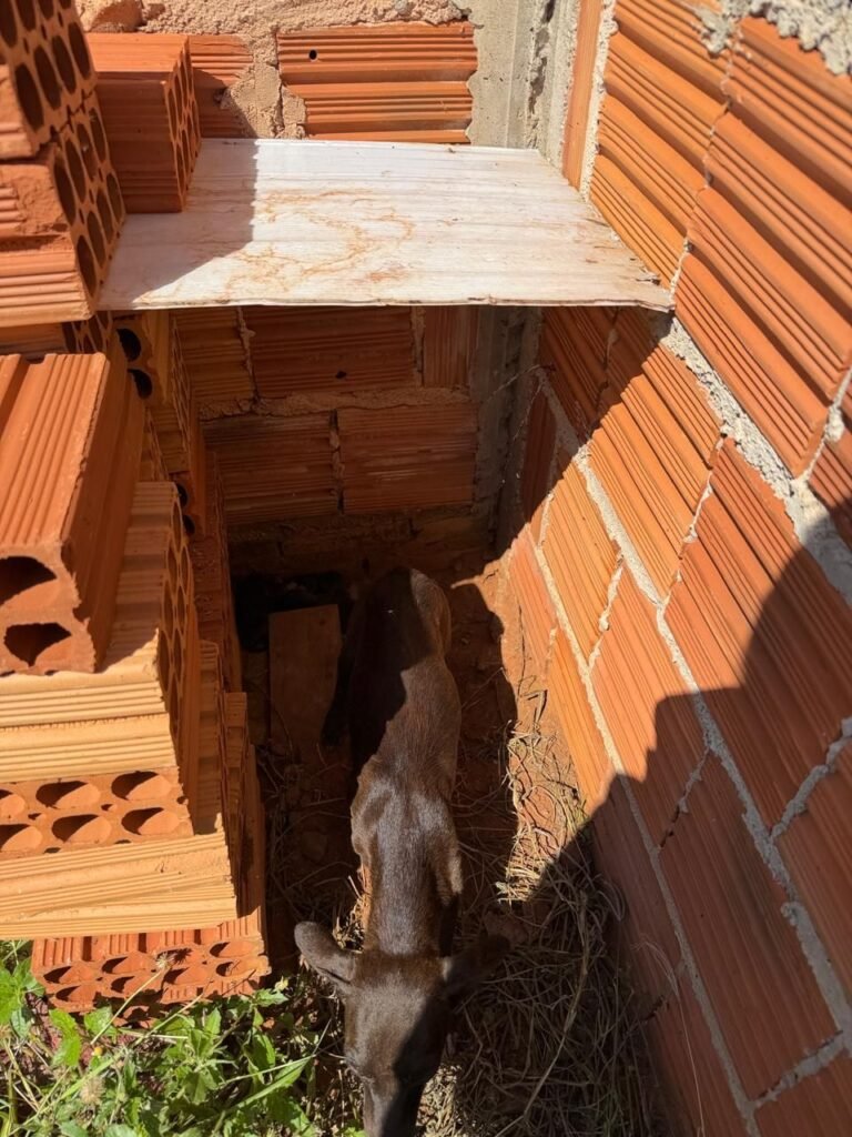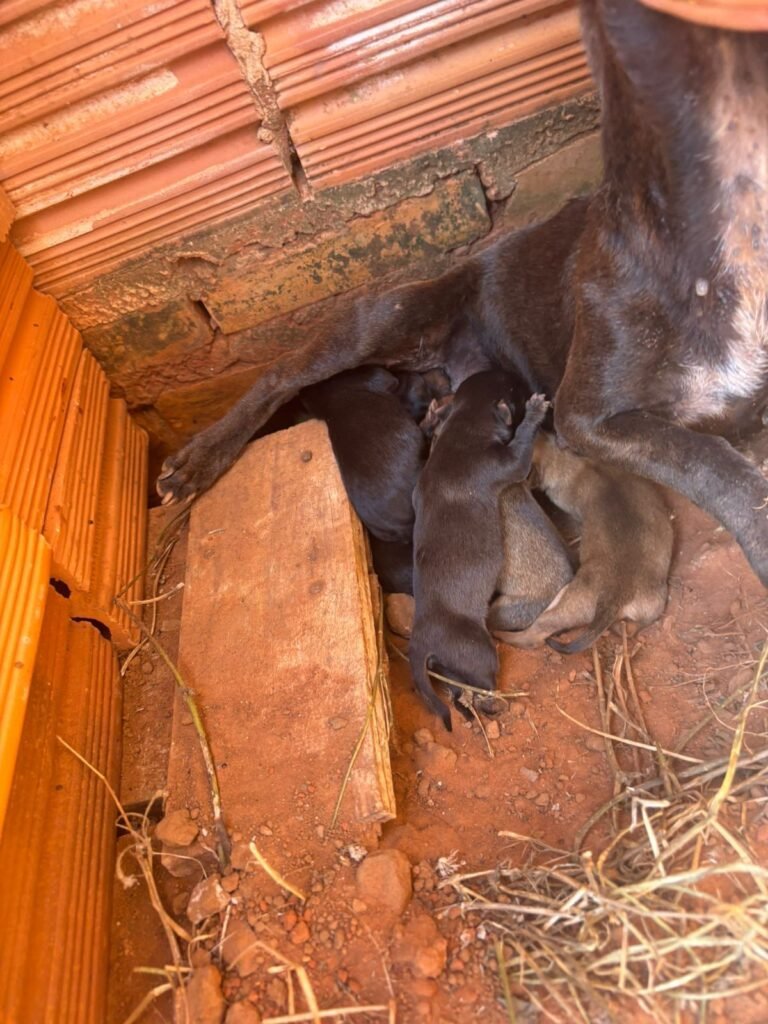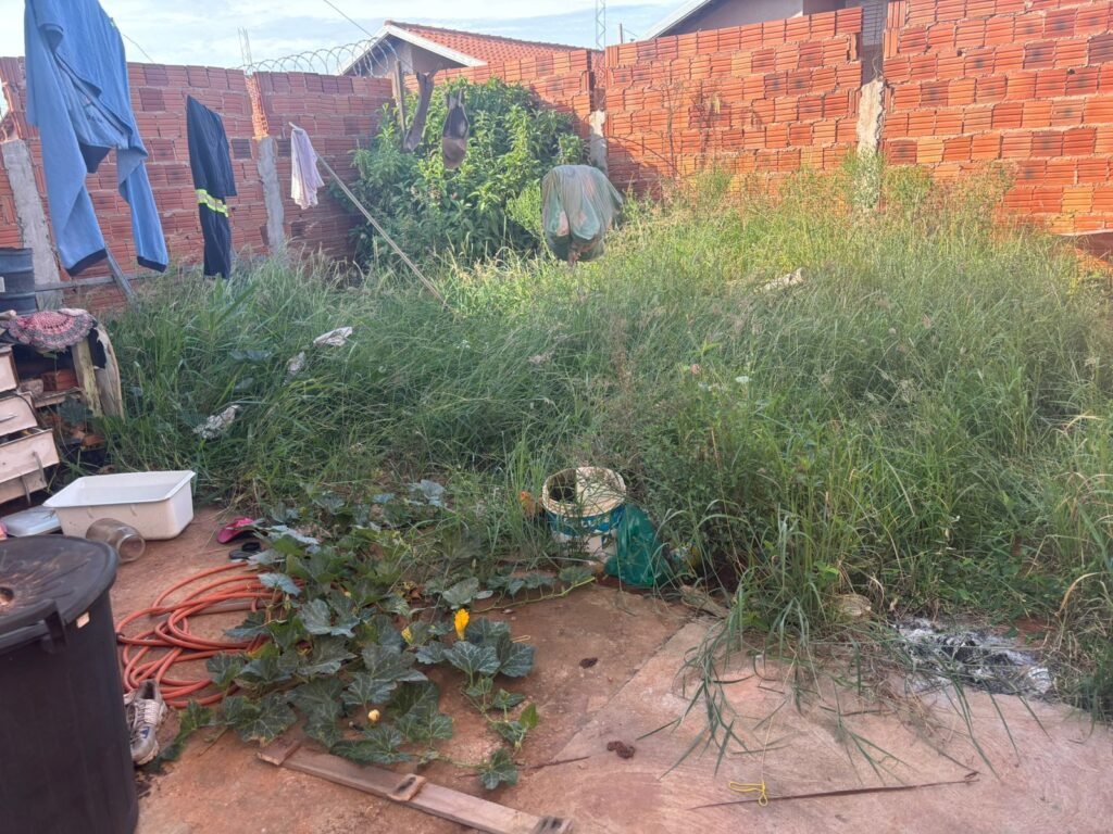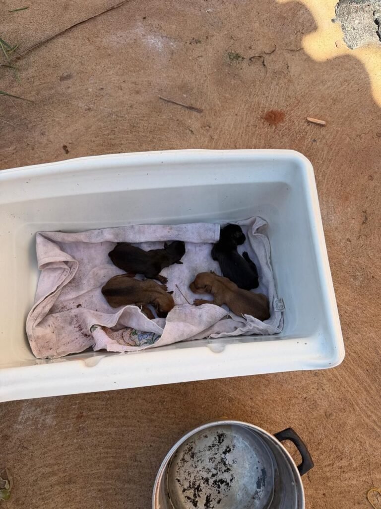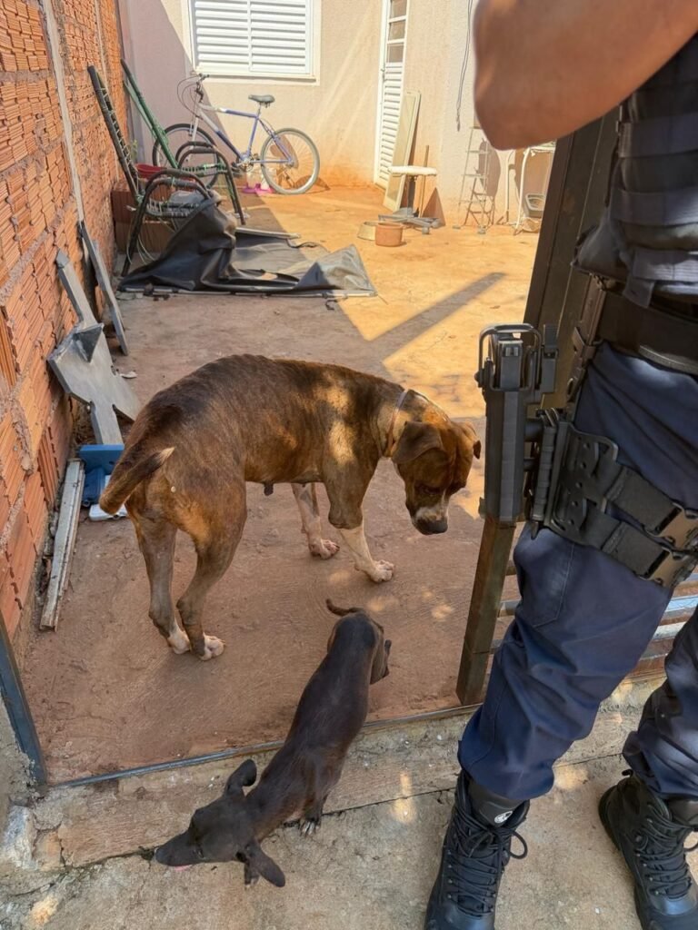 No fundo da residência, os GCMs encontraram um cenário de extrema insalubridade, com vegetação alta, acúmulo de dejetos e total ausência de higiene. No quintal estavam uma cadela da raça pitbull adulta, outra cadela sem raça definida e seis filhotes — um deles já em óbito, em um “ninho” improvisado.