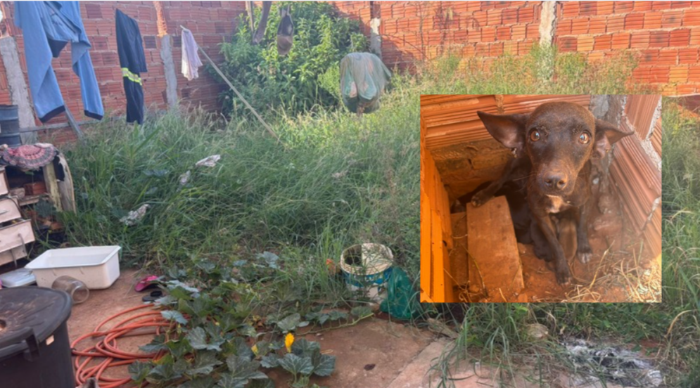 No fundo da residência, os GCMs encontraram um cenário de extrema insalubridade, com vegetação alta, acúmulo de dejetos e total ausência de higiene. No quintal estavam uma cadela da raça pitbull adulta, outra cadela sem raça definida e seis filhotes — um deles já em óbito, em um “ninho” improvisado.