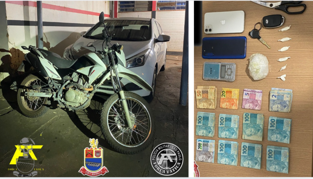 De acordo com a PM, equipes da Força Tática realizavam patrulhamento quando flagraram o suspeito vendendo cocaína a uma mulher. Ao perceber a aproximação da viatura, ela fugiu do local, enquanto o homem tentou escapar em uma motocicleta, mas foi alcançado e detido pela equipe.