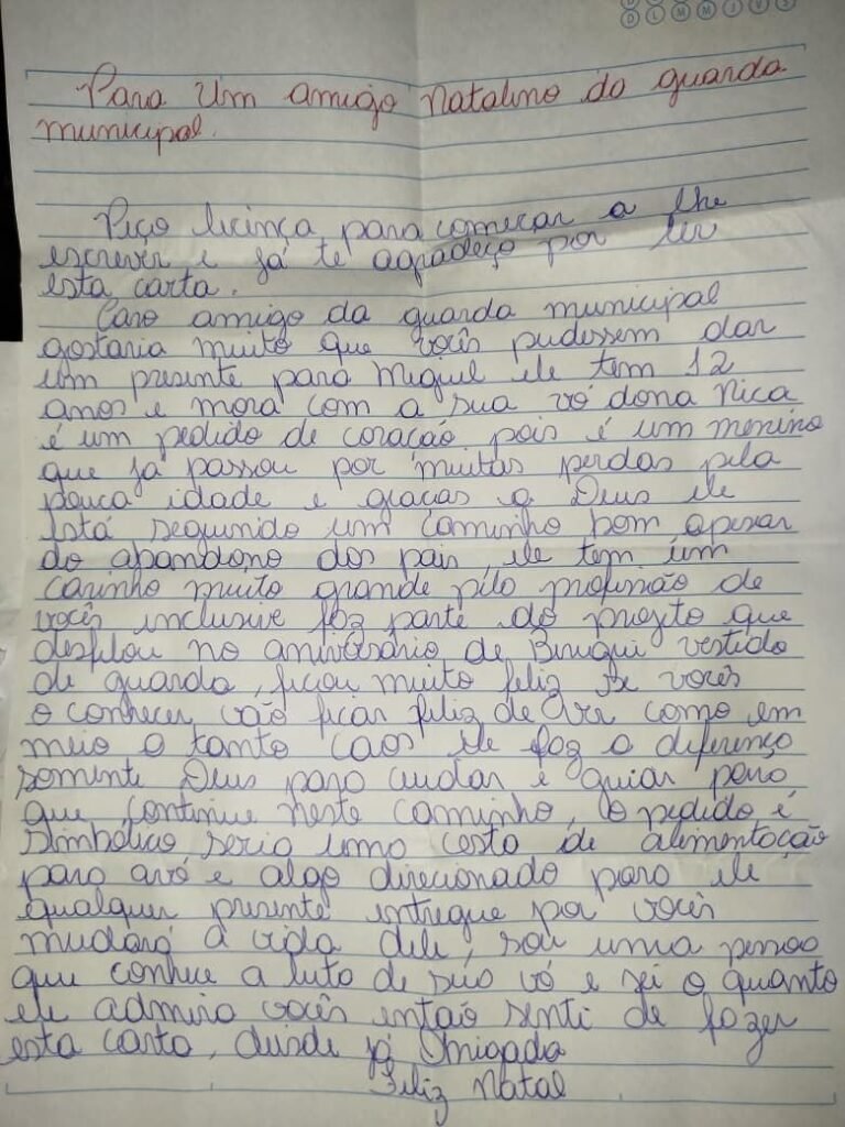 A pessoa que escreveu a carta não se identificou, apenas conhece o garoto.