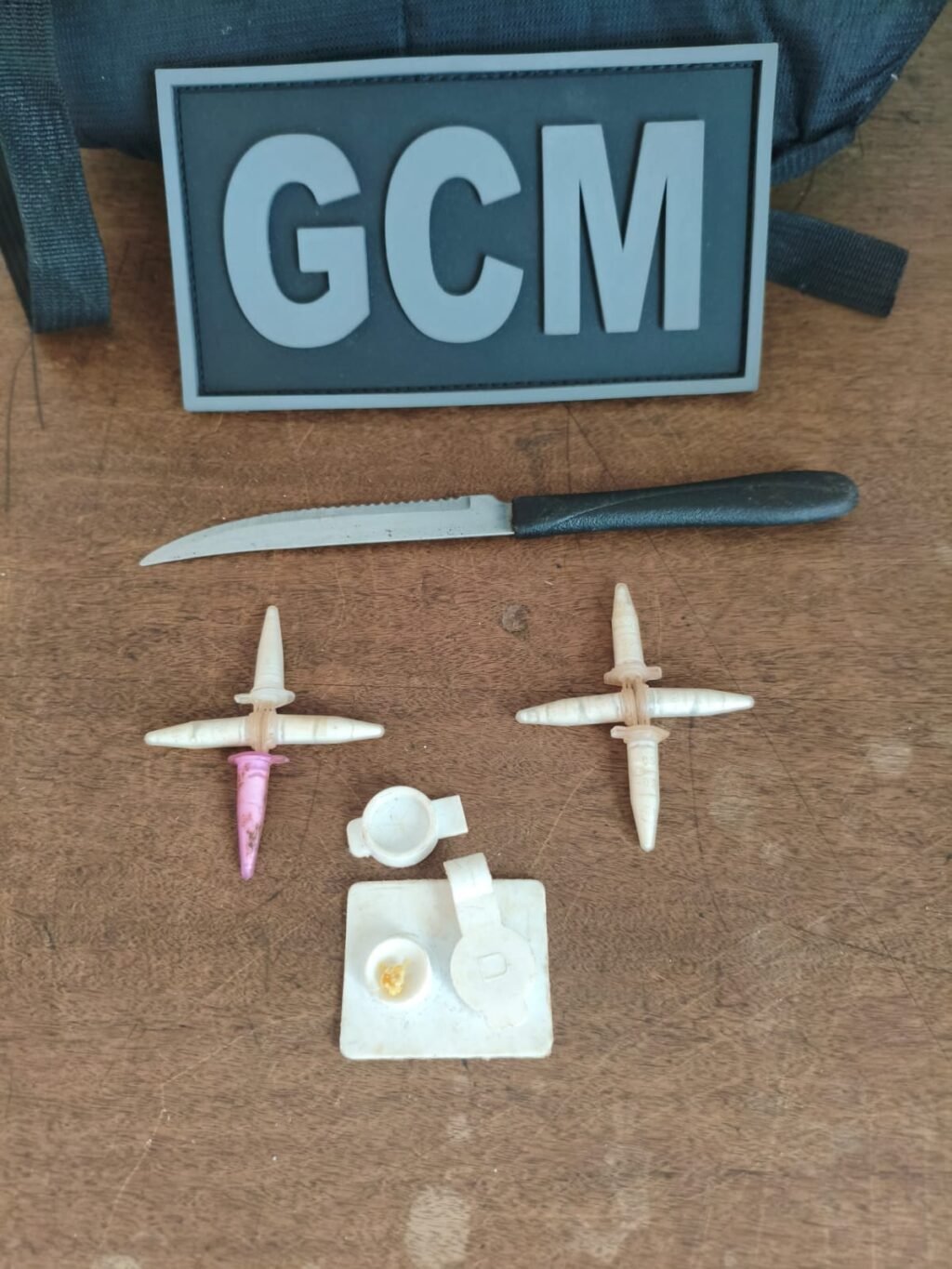 Durante a busca pessoal, os policiais localizaram, dentro de uma necessaire, uma bolsinha de óculos contendo oito eppendorfs com substância análoga à cocaína. Ainda em posse do abordado, foram encontrados diversos objetos, entre eles uma faca de mesa, uma haste de óculos, uma agulha hospitalar, um pedaço de cabo de fibra e um fragmento de cobre.