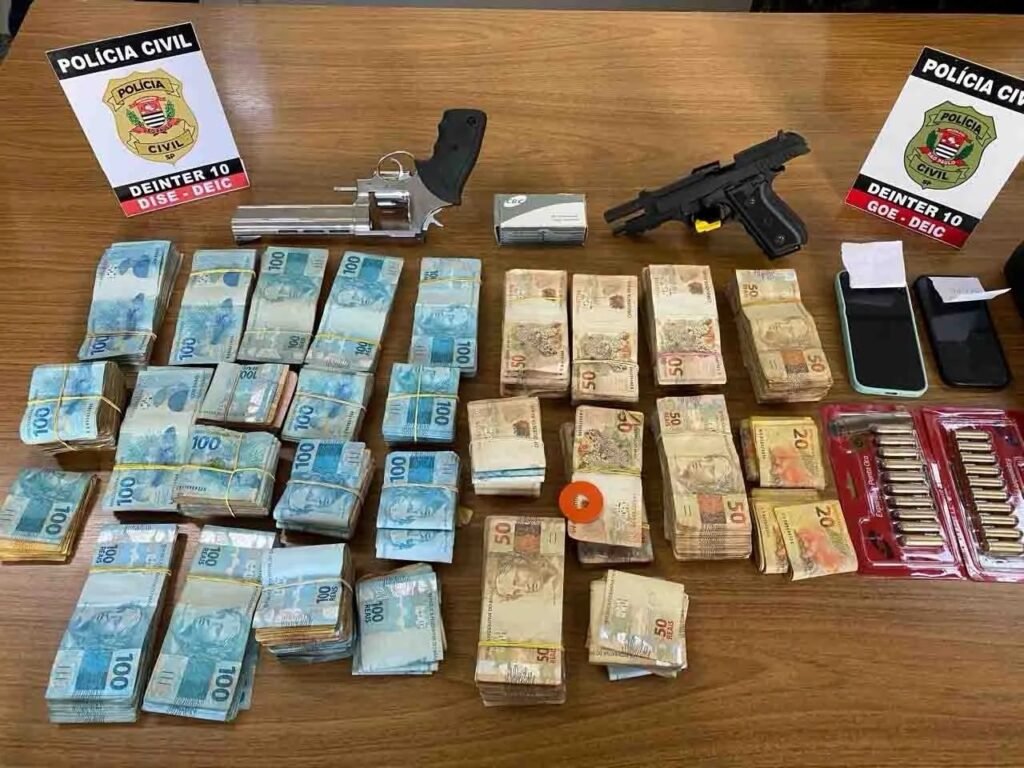 Quanto ao dinheiro apreendido, o investigado apresentou versões divergentes sobre a origem: inicialmente afirmou que o valor seria proveniente da venda de imóveis e, depois, alegou tratar-se de atividade de agiotagem. Sem comprovação documental, o montante foi retido para análise da autoridade policial.