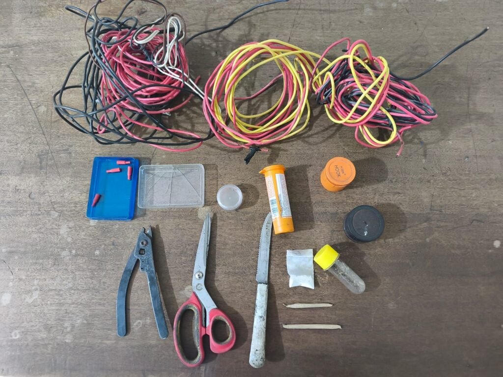 Próximo ao local onde o suspeito atuava, foram encontrados cerca de 900 gramas de fios elétricos já retirados e enrolados. Na caixa de disjuntores, os agentes localizaram uma faca de serra utilizada no corte da fiação, além de um objeto semelhante a um alicate. O homem também portava uma tesoura.