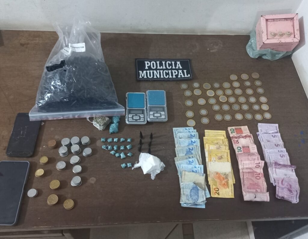 Durante a vistoria, foram encontradas 14 pedras de crack sobre a mesa da cozinha, além de moedas. Em uma carteira localizada sobre a geladeira havia R$ 294,00 em notas, além de duas cédulas com indícios de falsificação (R$ 10,00 e R$ 5,00). No quintal, dentro de um brinquedo infantil do tipo “motoquinha com baú”, os guardas localizaram porções de maconha, duas pedras maiores aparentando ser cocaína, seis pinos de cocaína, duas balanças de precisão e pinos vazios.