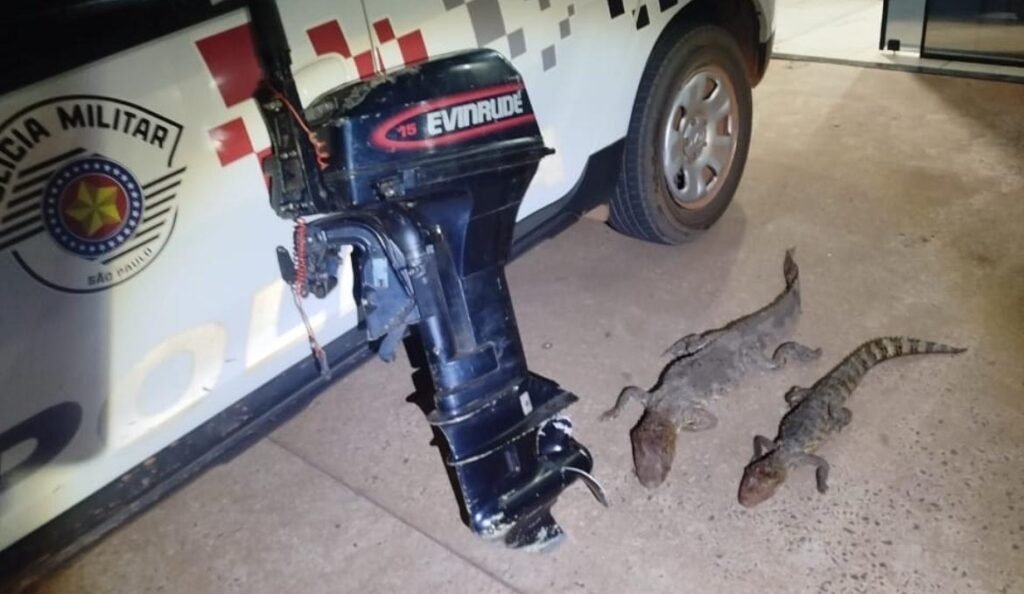 Além dos dois jacarés, a polícia encontrou uma espingarda calibre 20, um cartucho já deflagrado, pólvora, chumbo e um motor de popa.