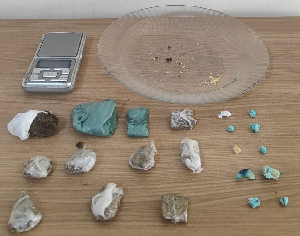 Durante a vistoria, os militares localizaram 11 porções de maconha, 10 porções de crack, uma balança digital e um prato de vidro com resquícios de drogas. O homem tentou alegar ser apenas usuário, mas diante do material apreendido e de seus antecedentes criminais — incluindo passagens por tráfico (art. 33), ameaça (art. 147), furto (art. 155) e roubo (art. 157) —, foi dada voz de prisão.