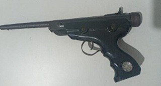 Durante a vistoria, os policiais encontraram, escondida no forro da sala, uma pistola de pressão modificada para disparar munição calibre .22.