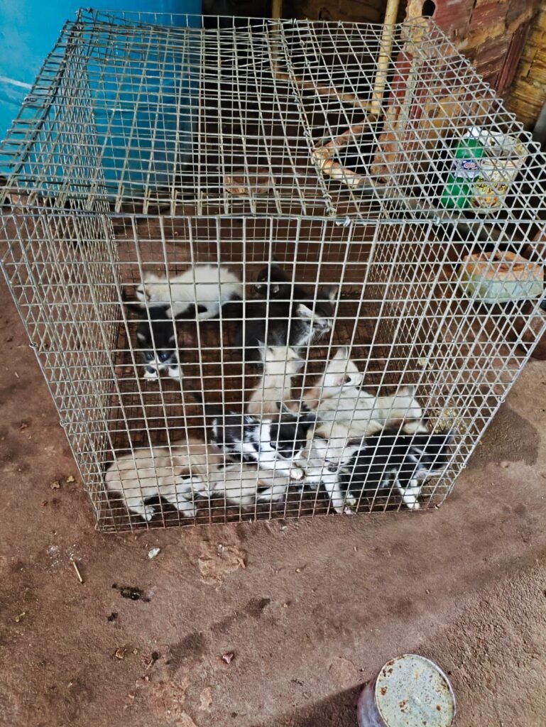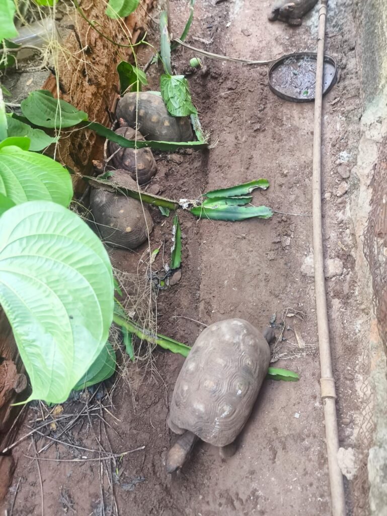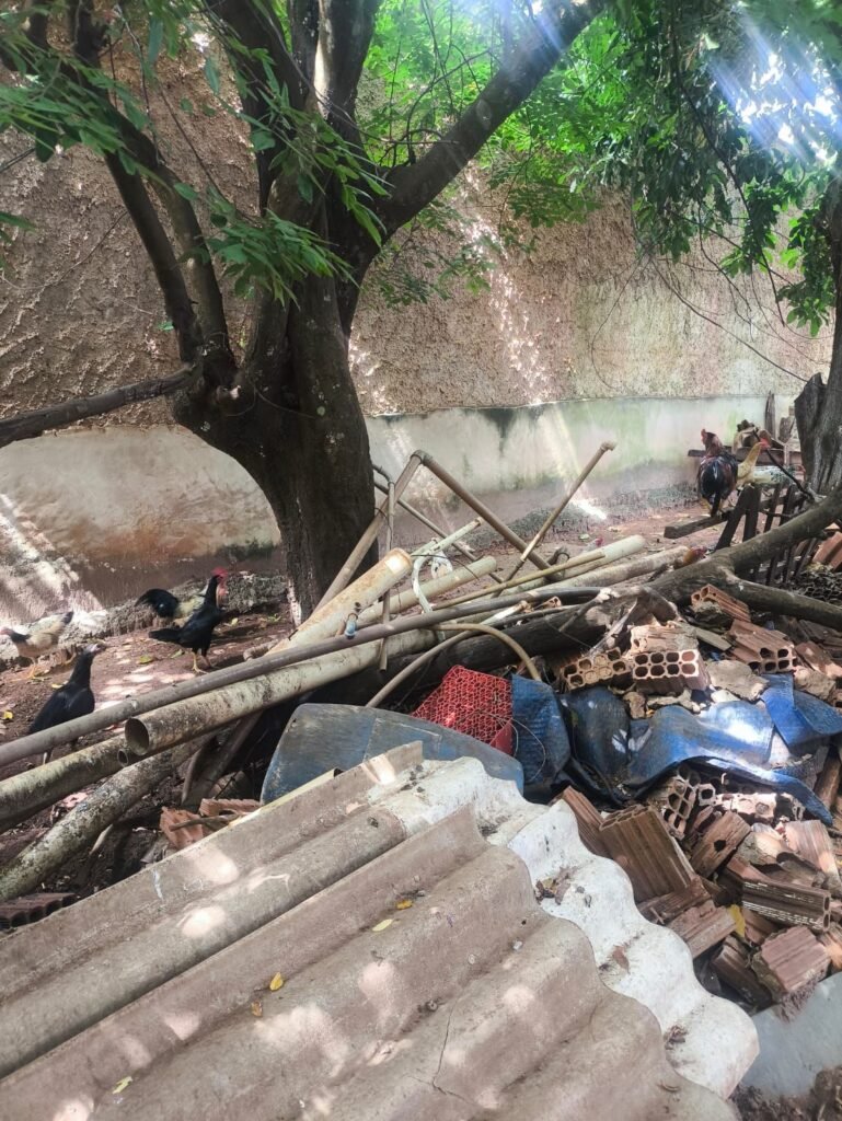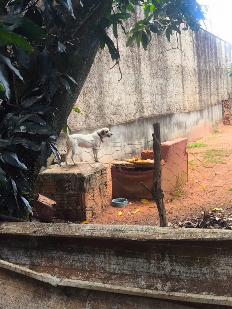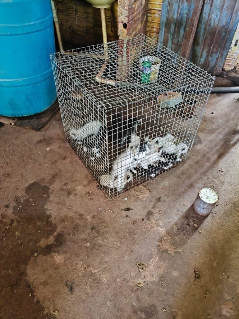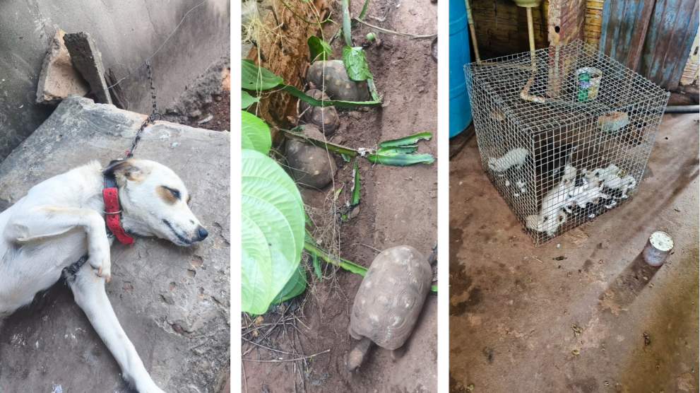 No interior da residência, a situação chamou ainda mais atenção: 12 filhotes de gatos estavam confinados em uma gaiola de grande porte, sem acesso à água, além de outros gatos soltos pela casa. Já na parte externa, foram encontrados sete jabutis, três galinhas em um cercado de cerca de um metro, aproximadamente 30 galinhas soltas e um galo mantido em espaço bastante reduzido.