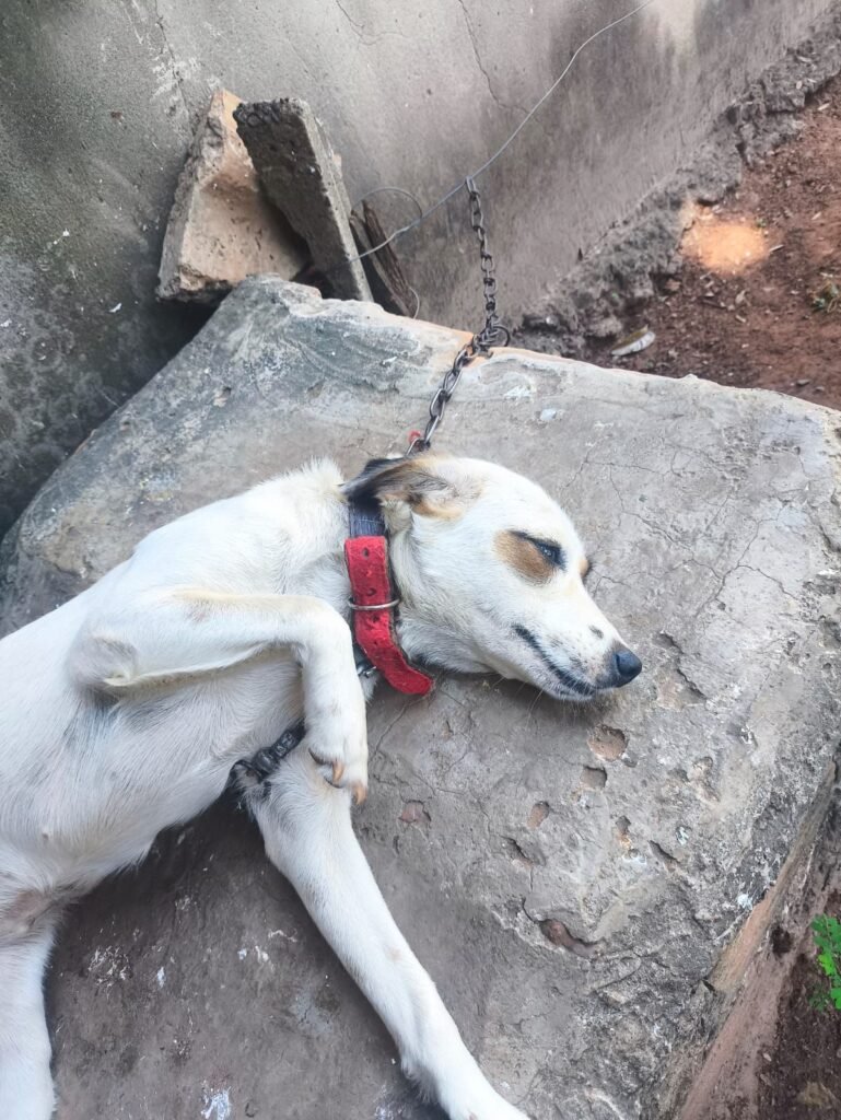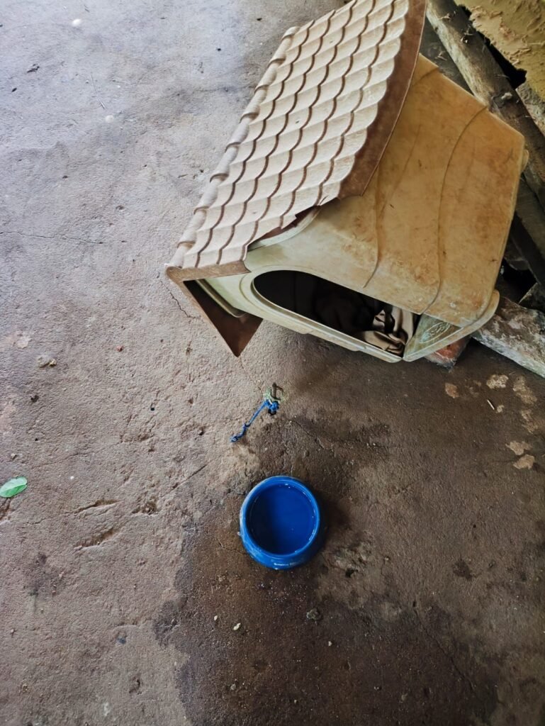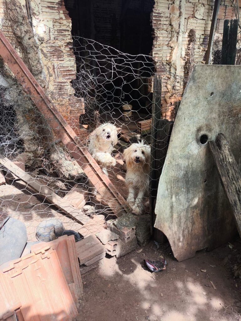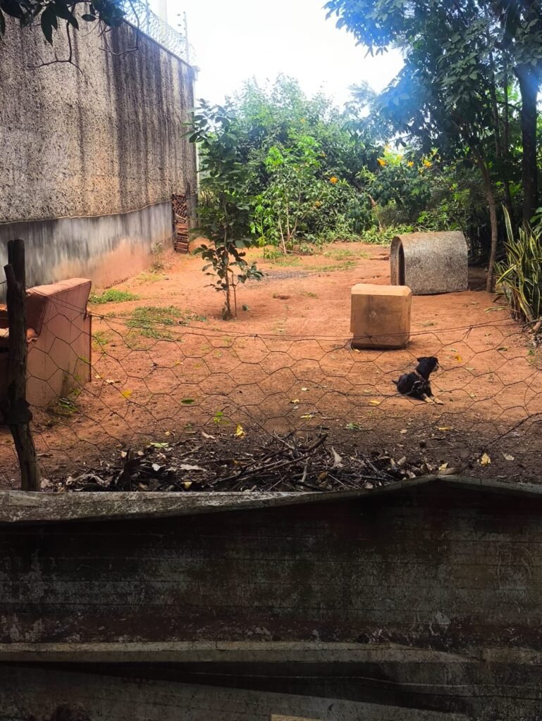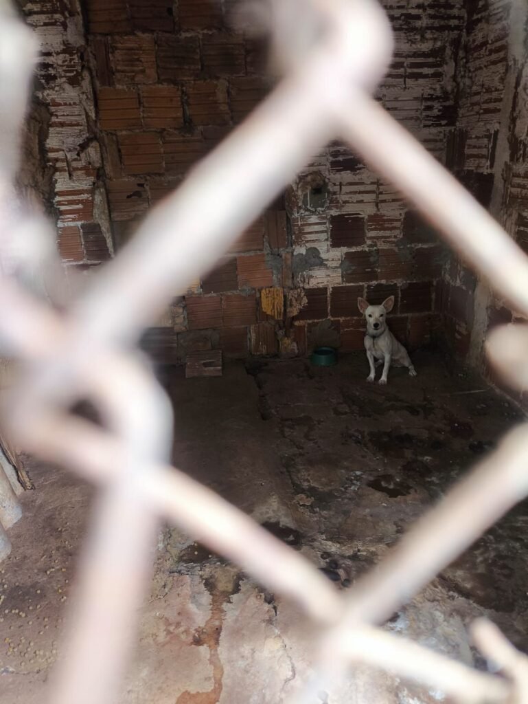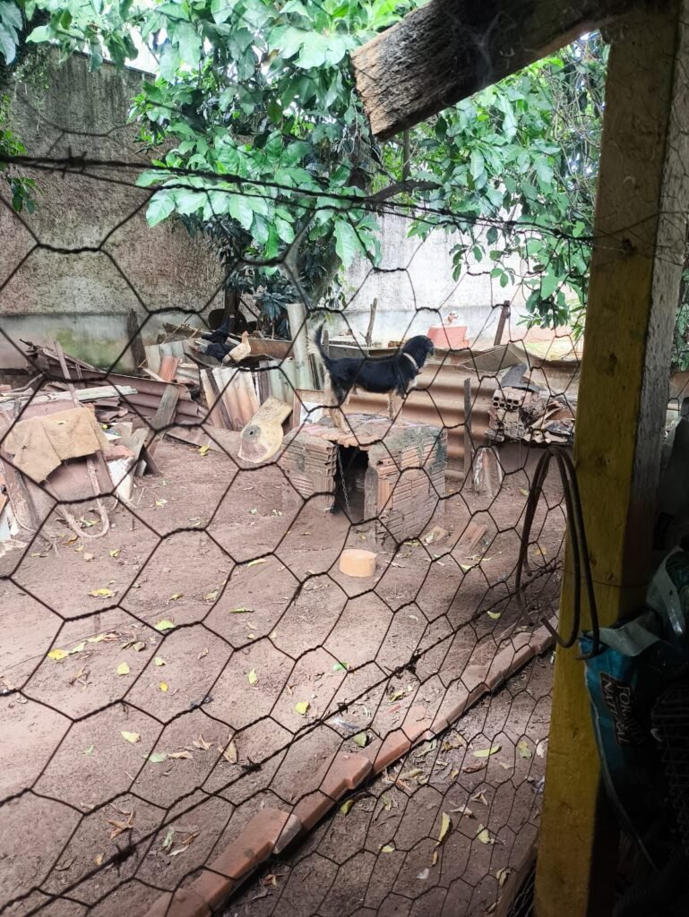 Durante a vistoria, foram identificados três cães presos por correntes curtas, com mobilidade restrita a uma área de aproximadamente cinco metros, além de outros cães soltos pelo terreno e alguns mantidos em cercados nos fundos, sendo que um deles também estava acorrentado.