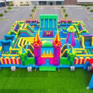A proposta vai além de um parque tradicional. O espaço reúne circuitos de obstáculos, torres, escorregadores e estruturas infláveis gigantes que chegam a até oito metros de altura, criando um ambiente dinâmico e interativo.