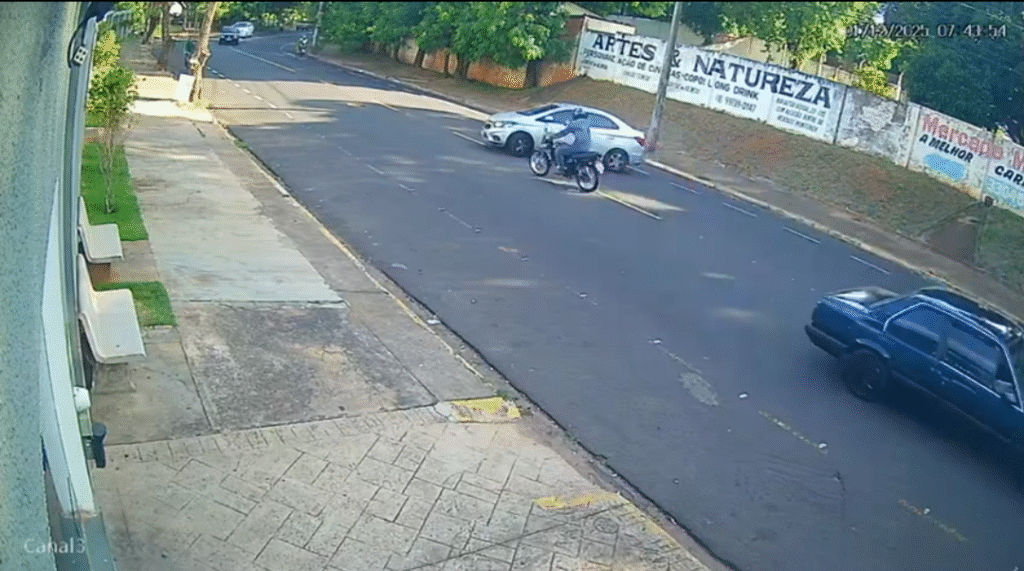 Conforme imagens de câmeras de segurança, o motociclista ainda tentou se esquivar do automóvel, entretanto, não conseguiu e acabou chocando com o carro. Devido ao impacto, ele foi jogado na calçada e seu veículo atingido na parte dianteira.