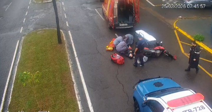 Mulher de 37 anos é socorrida após sofrer queda de moto em frente ao Batalhão da GCM em Birigui.