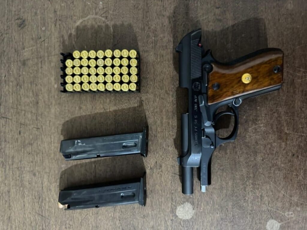 Temendo por sua segurança, a mulher informou aos policiais que o companheiro mantinha uma arma de fogo na residência do casal. Os militares realizaram buscas e encontraram, em uma gaveta do closet do quarto, uma pistola Taurus modelo 58S, calibre .380 ACP, municiada com seis munições intactas. Também foram localizados dois carregadores (um deles vazio) e uma caixa com 44 munições intactas, totalizando 50 munições apreendidas.