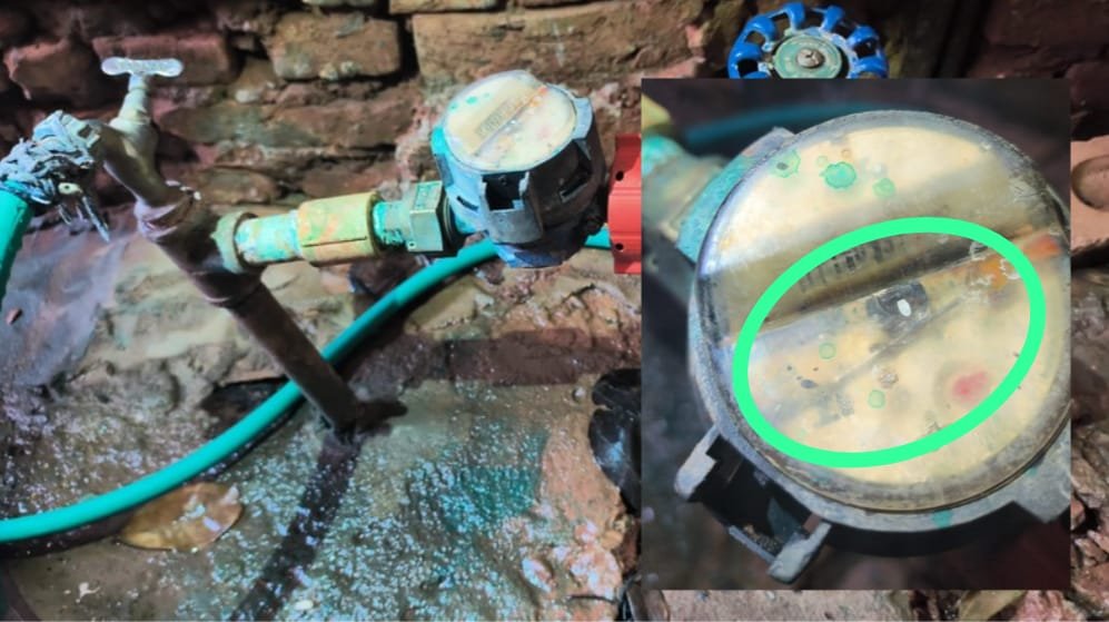 Durante apoio ao SAEB, GCM encontrou agulha colocada no hidrômetro para impedir a medição do consumo de água. (Foto divulgação).