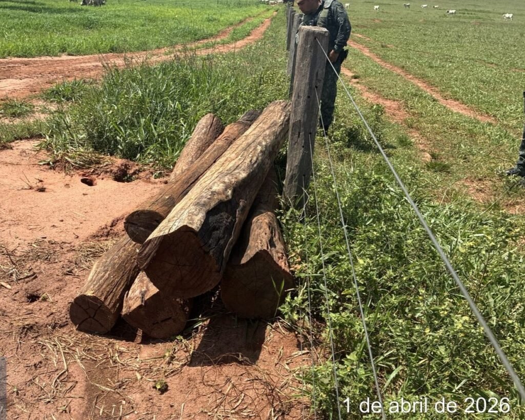 Durante o patrulhamento, a equipe constatou irregularidades no interior da propriedade, onde havia o depósito de 0,836 metros cúbicos de madeira nativa em forma de toras, sem a devida autorização legal.