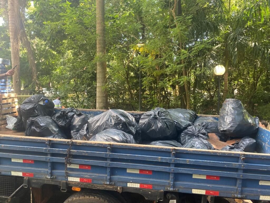 Durante o mutirão, foi recolhido um caminhão de resíduos descartados irregularmente no parque, entre eles garrafas, sacolas plásticas, copos descartáveis e outros objetos.