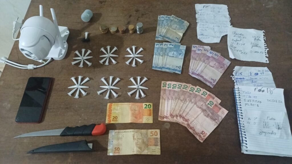 Durante revista pessoal, foram localizados com um dos homens dois invólucros aparentando ser crack, R$ 70,00 em dinheiro e uma faca na cintura. O outro suspeito levava dinheiro e anotações utilizadas no controle do tráfico. No imóvel também havia uma câmera posicionada para monitorar a rua, recurso comum em pontos de venda de drogas para vigiar a aproximação de usuários ou de equipes policiais.