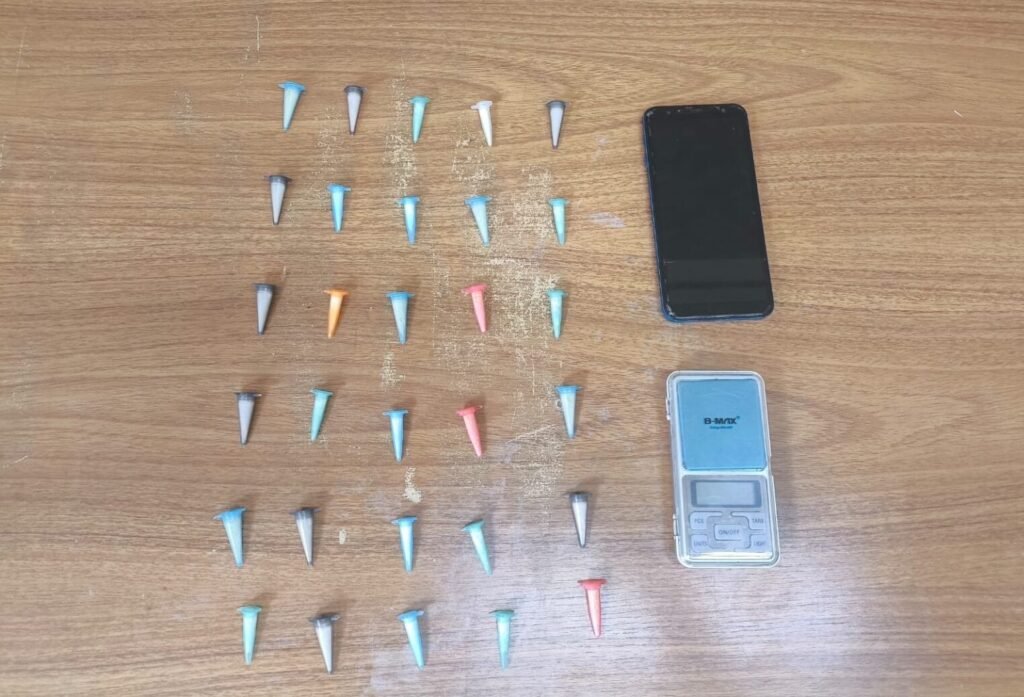 Durante a fuga, ele dispensou o celular — que estava em ligação contínua, supostamente monitorando o patrulhamento — e a sacola, que continha 30 pinos de cocaína e uma balança de precisão digital.