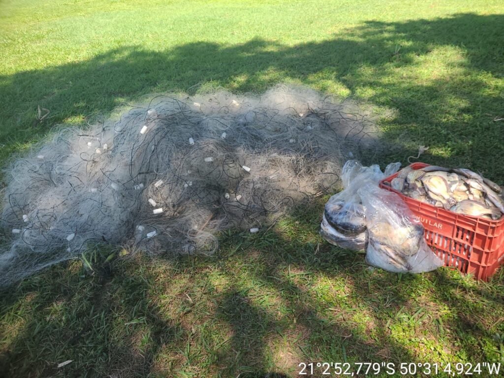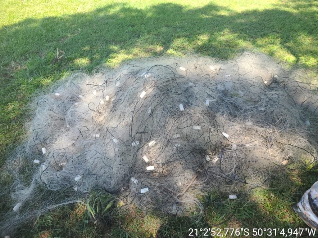 A ação ocorreu no contexto da Operação “Algae Fase VI”, após denúncia sobre possível prática de pesca ilegal na região. No local, os policiais localizaram quatro cordões de redes de nylon armados de forma irregular, totalizando 1.550 metros de extensão, com malha de 80 mm.