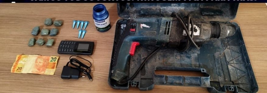 A equipe se deslocou até o endereço mencionado e conseguiu abordar o segundo homem. Durante a revista, foram localizados uma furadeira dentro da maleta e, em uma pochete que ele levava na cintura, um aparelho celular da marca Nokia, R$ 20,00 em dinheiro, oito porções de maconha e seis pinos contendo cocaína.