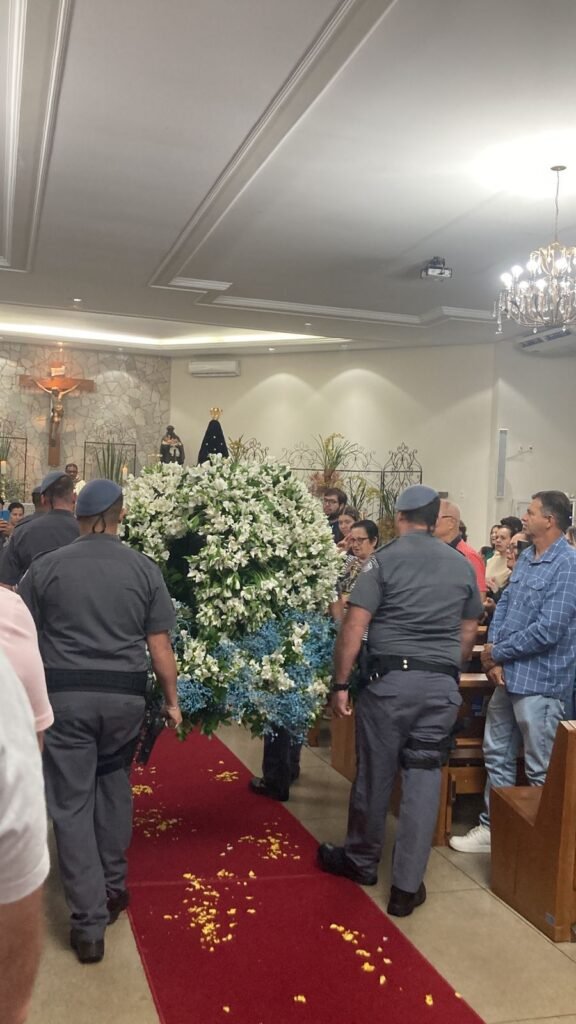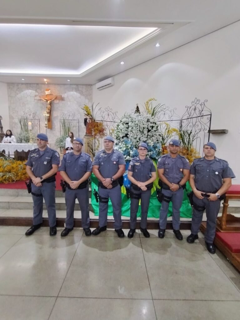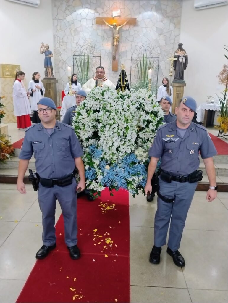 Atendendo ao pedido da comunidade católica, seis policiais militares participaram do momento solene: Cabos Junior, Doná e Farias, e Soldados Barbeiro, Cortinovis e Thomazin. Os militares estiveram presentes desde as 17h30, colaborando com os preparativos e conduzindo com respeito e devoção o andor durante a celebração.