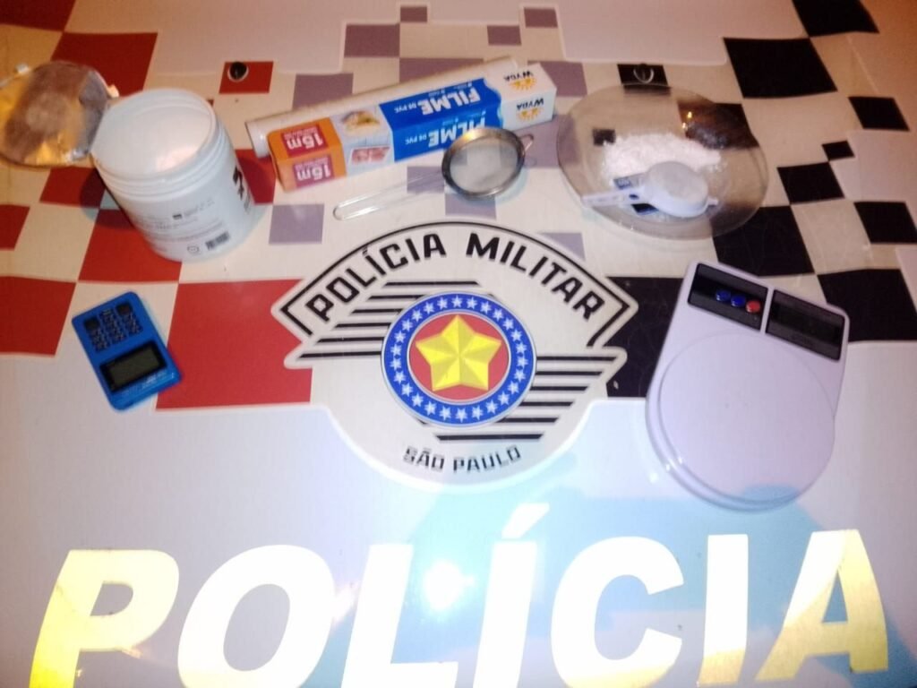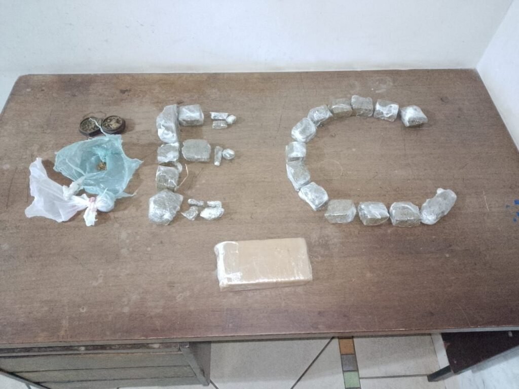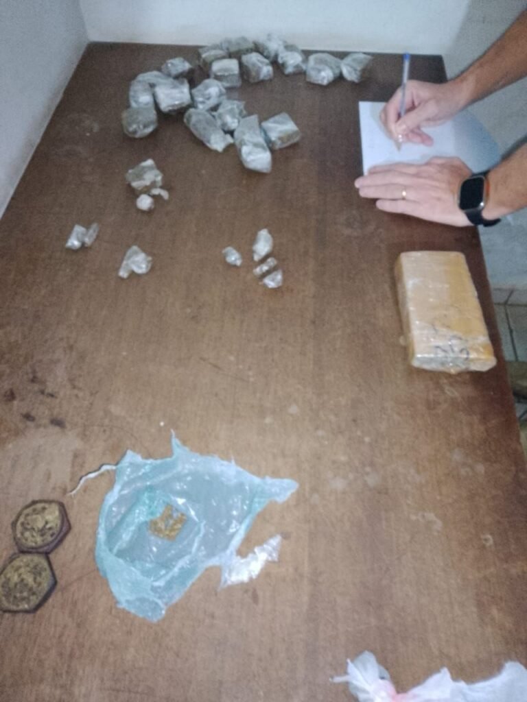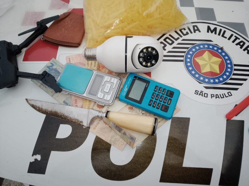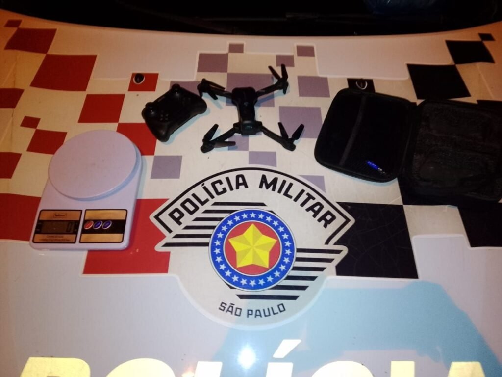 No interior do imóvel, foram apreendidas aproximadamente 1,236 kg de maconha, 0,5 kg de cocaína, 283 eppendorfs cheios e 553 vazios, balança de precisão, máquina de cartão, drone da marca Vicky Mini, câmeras de vigilância, peneiras, bandejas, facas e rolo filme utilizados no preparo dos entorpecentes, além de R$ 212,00 em dinheiro.