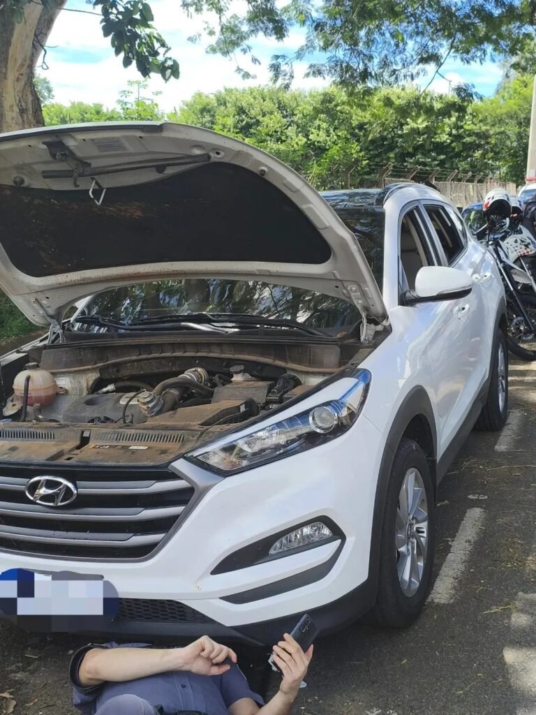 No local, os policiais localizaram um Hyundai Tucson, cor branca, que estava em posse da mulher de 26 anos. O veículo apresentava placas no padrão Mercosul incompatíveis com o histórico de circulação. Após consulta aos sistemas e varredura minuciosa, foi constatado que o automóvel possuía registro de furto no município de Suzano.
