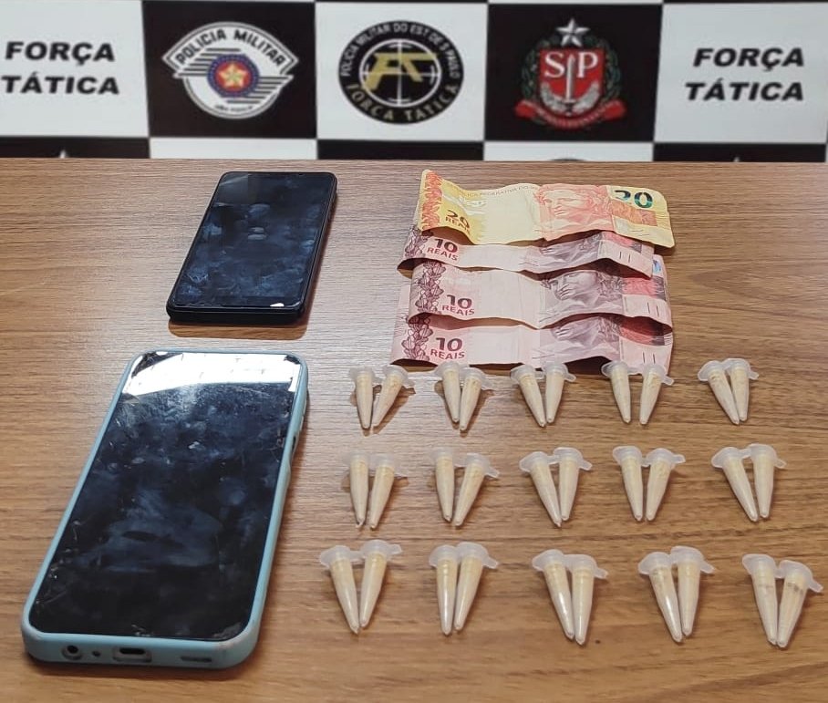 Os policiais observaram o momento em que o homem entregou algo para mulher, que guardou o objeto no bolso da bermuda, o que motivou a abordagem. Durante a revista pessoal, com ele foi localizado apenas um celular. Já com a mulher, os policiais encontraram R$ 50,00 em notas diversas, outro celular e um saco plástico contendo 30 pinos de cocaína.