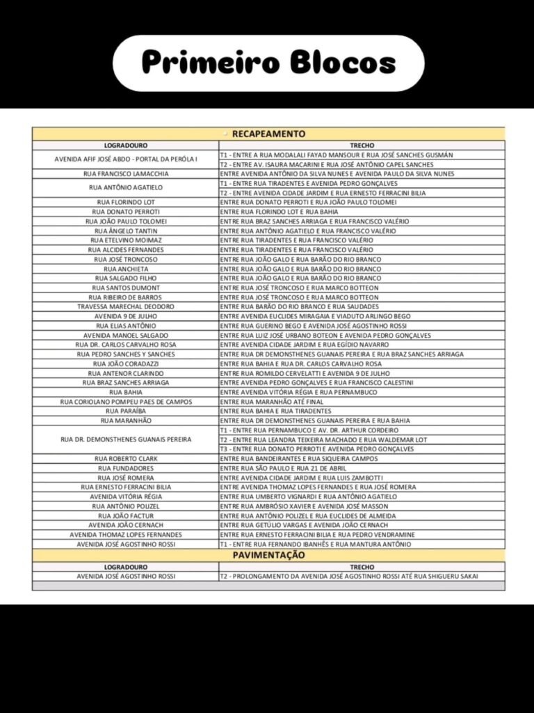 Conforme o cronograma divulgado, o primeiro bloco de recapeamento inclui diversas ruas e avenidas, abrangendo bairros como Portal da Pérola, Jardim Cidade Jardim, Jardim Stábile, Silvares, entre outros. As intervenções envolvem recapeamento asfáltico e, em um trecho específico, pavimentação, como o prolongamento da Avenida José Agostinho Rossi até a Rua Shigeru Sakai.