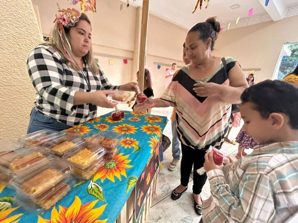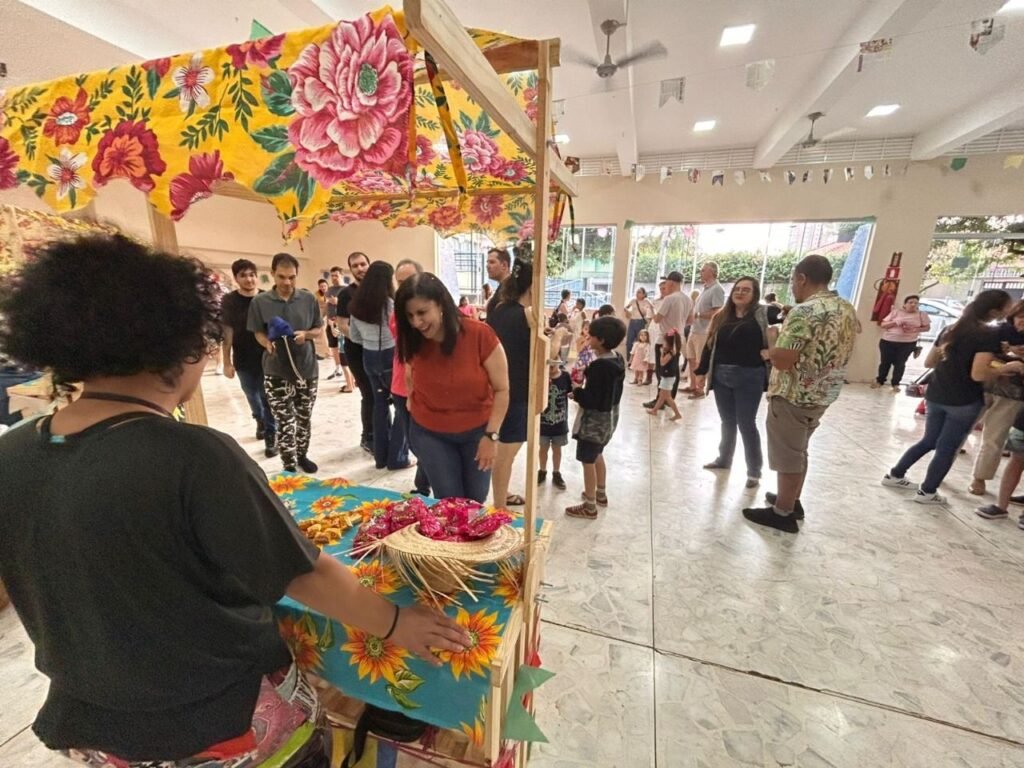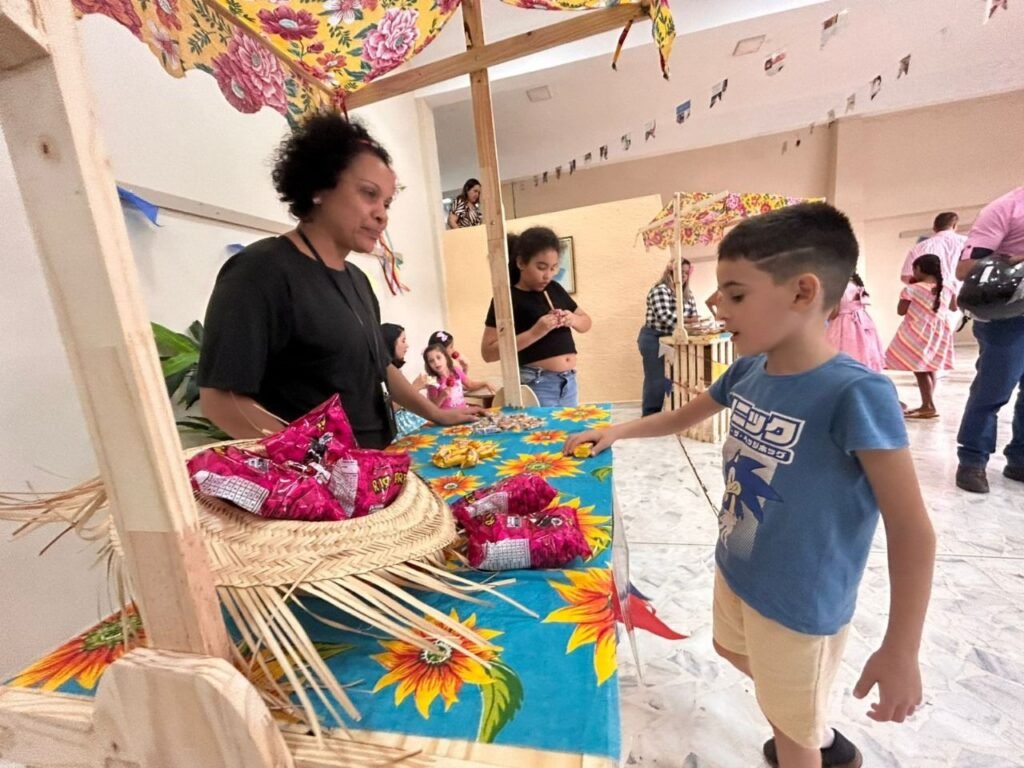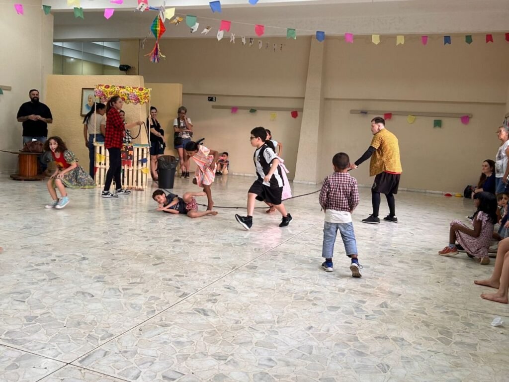 A programação teve início às 16h com a contação da história “A Fogueira de Dona Sinhá”, voltada ao público infantil e adulto. Em seguida, foram abertas as barracas com comidas típicas e brincadeiras juninas, animando os presentes em clima de festa.
