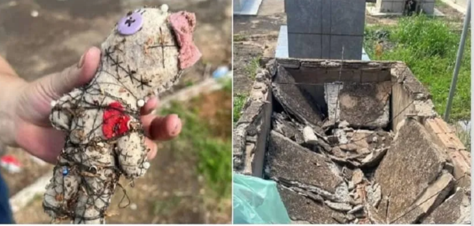 Uma família de Dracena (SP) passou por um momento de choque e indignação ao encontrar o túmulo de um ente querido violado no Cemitério Municipal da cidade neste sábado (7). Ao chegar ao local para prestar homenagem, os parentes notaram que a parte superior da sepultura estava quebrada e, dentro dela, encontraram um boneco com várias agulhas cravadas e amarras nos membros e na cabeça, causando constrangimento e revolta.