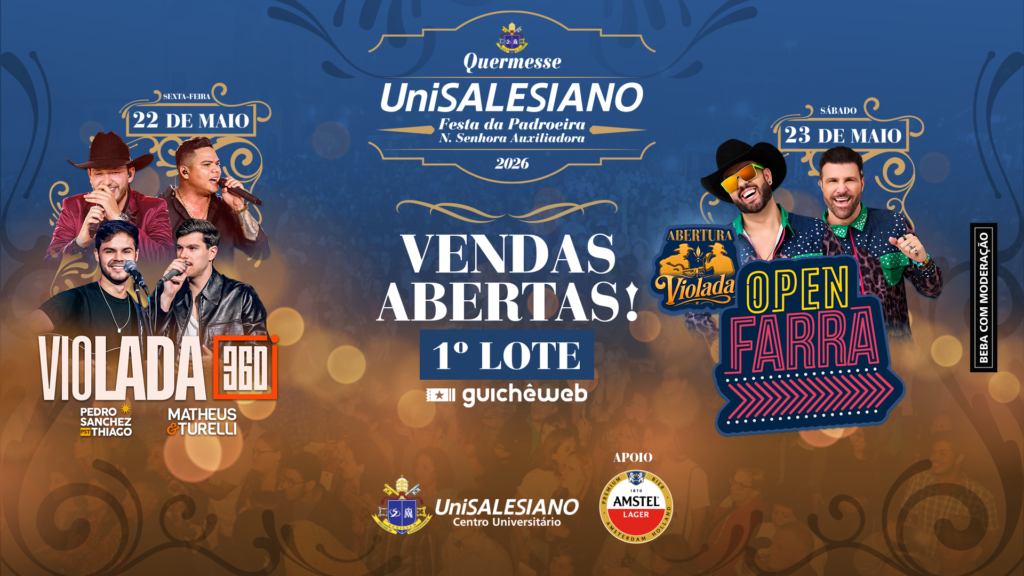 Os ingressos já estão disponíveis pela plataforma Guichê Web – https://www.guicheweb.com.br/quermesse-unisalesiano-2026_52076 – com opção de ingresso solidário mediante a doação de 1 kg de alimento. No primeiro lote, até 14 de maio, o valor é de R$ 30; no segundo lote, de 15 a 21 de maio, passa a R$ 40; e, no dia do evento, será de R$ 50. Crianças de até 11 anos têm entrada gratuita. A expectativa é reunir a comunidade acadêmica e o público da região em um ambiente de celebração, tradição e solidariedade.