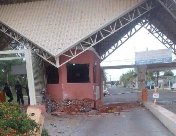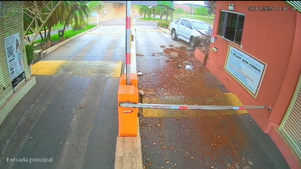 Câmeras de segurança registraram o momento do acidente. Nas imagens, é possível ver o veículo trafegando desgovernado em alta velocidade, atravessando o canteiro central e colidindo frontalmente contra a estrutura da guarita.