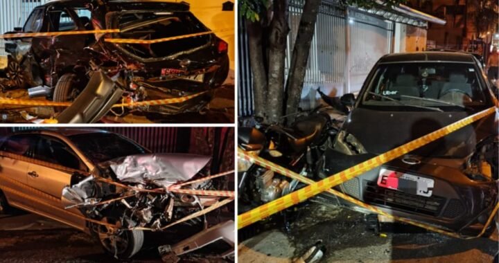 Condutor de Corolla foge a pé após causar grave acidente e destruir dois carros e duas motos em Birigui